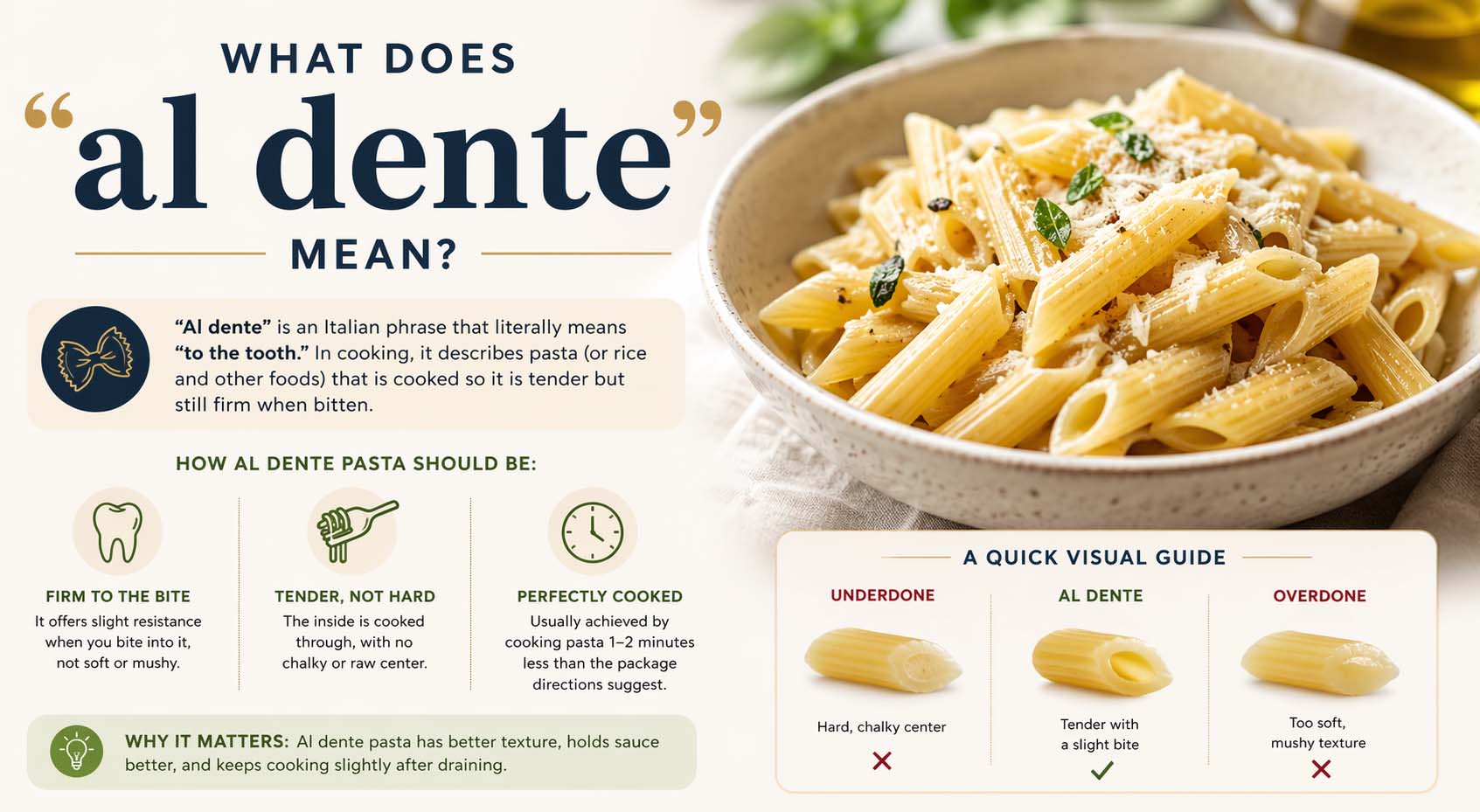 If you have ever cooked pasta or read an Italian recipe, you may have wondered what does al dente mean. This common culinary term is